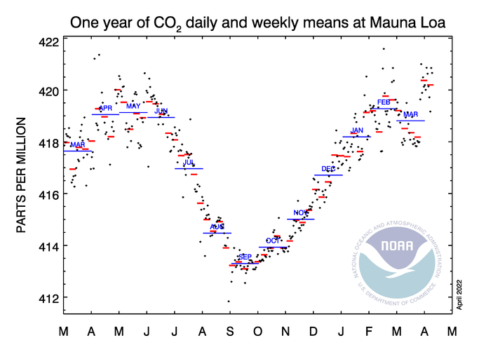 Enligt senaste mätningen uppmätt på på Mauna Loa på Hawaii ligger koldioxidhalten i atmosfären nu på 420,66 miljondelar (ppm). Det är ungefär på samma nivå som förra veckans notering på 420,86 ppm. Jämfört med för exakt ett år sedan är det en ökning med 1,34 ppm. Sammantaget låg halten koldioxid under februari månad på 419,28 ppm, vilket är en ökning med 2,53 ppm jämfört med februari 2021.
