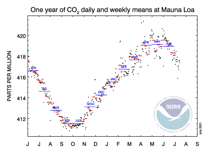Koldioxidhalten i atmosfären har nu nått historiska nivåer med ett månadsgenomsnitt på nästan 419 ppm i maj och dagsrekord på 421 ppm. Det är den högsta månadsnivån sedan mätningarna började för 63 år sedan vid NOAA:s Mauna Loa-observatorium på Hawaii. Ökningen för hela 2020 var cirka 2,30 ppm jämfört med 2019 och är en del i en tydlig trend.