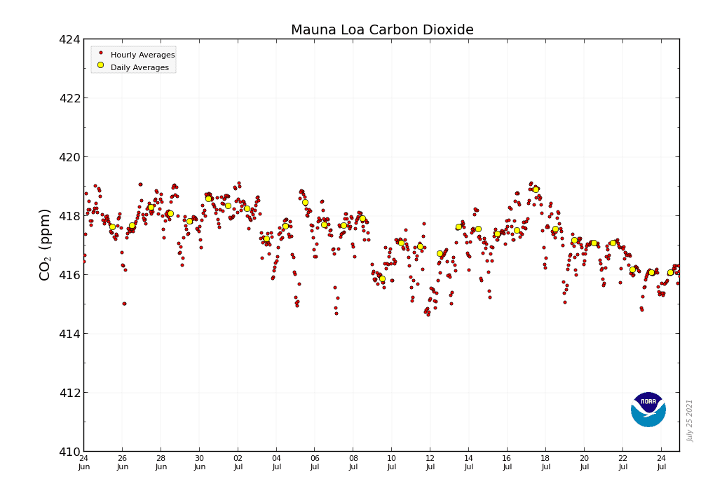 Enligt senaste mätningen uppmätt på Mauna Loa på Hawaii ligger koldioxidhalten nu på 417,39 miljondelar (ppm). Det är ungefär lika mycket som förra veckans notering på 417,07 ppm. Koldioxidhalten i atmosfären har nu nått historiska nivåer med ett månadsgenomsnitt på nästan 419 ppm i maj och dagsrekord på 421 ppm. Det är den högsta månadsnivån sedan mätningarna började för 63 år sedan vid NOAA:s Mauna Loa-observatorium på Hawaii.